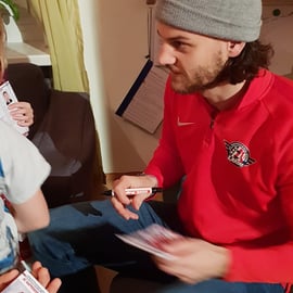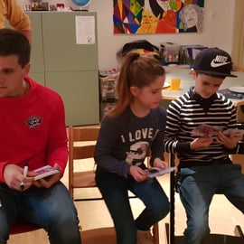 Einer dieser grosszügigen Gönner hat uns gleich nach Stäfa begleitet. Die SCRJ Jona Lakers, namentlich Trainer Jeff Tomlinson und die Spieler Cédric Hüsler, Dion Knelsen und Melvin Nyffeler haben die Augen der Kinder erstrahlen lassen. Diese nutzten die Gunst der Stunde und fragten die gutgelaunten Eishockey-Profis nach ihren Erfahrungen und Eindrücken als Profisportler. Für die staunenden Kinder war die herzliche Offenheit der Vorbilder ein spezielles Erlebnis. Fragen wie „Hatten Sie schon eine Rauferei auf dem Eis?, Wie viele Zähne haben Sie als Eishockeyspieler schon verloren? Wie viele Stunden pro Woche trainieren Sie? oder Was war Ihre schlimmste Verletzung bisher?“ wurden mit einer gesunden Portion Witz beantwortet.